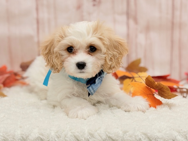 淡いブレンハイムカラーが可愛らしい"キャバション"ちゃん。穏やかな性格で寝るのが大好きで、お店に来た初日から呼んでも撫でても起きないほどの爆睡を見せてくれました。笑