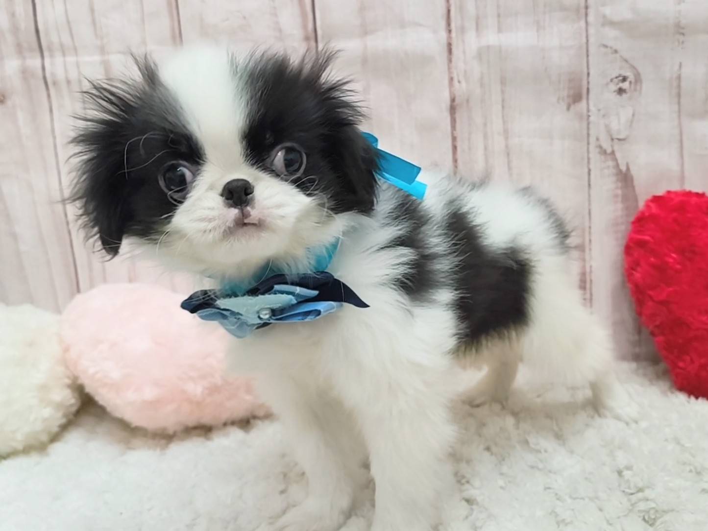 特徴的な白黒模様と大きな目が可愛らしく、狆ちゃんの被毛は成長するとどんどん長くなります。また、大人になった際の毛並みは絹の様と言われることも。毎日のお手入れが肝要です!