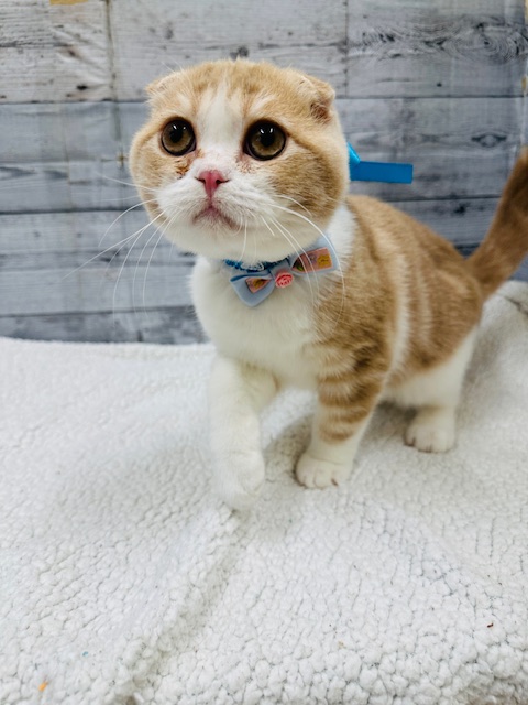 まんまるくて大きいおめめの愛らしいお顔をしているスコティッシュフォールドの男の子が新しく仲間入りしました♪好奇心が旺盛で、今は何にでも興味津々♡♡とっても元気で、オモチャをすっ飛ばしては追いかけ回して遊んでおります♪折れ耳のスコちゃんなのでお顔がまん丸でとっても可愛いです♪